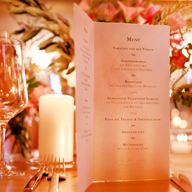 Einem Flying Buffet mit Fleischpflanzerln im Cone, Parmesansüppchen, Bergkäse-Quichettes und strammen Mäxchen folgten Nordeekrabben auf Kräuterrührei, zarter Rehrücken, gebratener Tegernseer Saibling und Trüffel-Pasta, bevor sich Créme Brulée, Tiramisu, ein schokoladensattes Dreierlei, Petits Fours und Fruchttartelettes an Appetitlichkeit zu überbieten suchten. Dazu eine feine Käseauswahl und unsere legendäre Currywurst als Mitternachtssnack: Auch hier also langfristig eine rundum verlockende Perspektive!